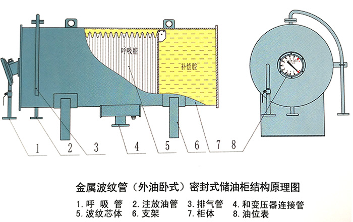 金屬波紋(外油臥式)密封式儲油柜,作為保護油質(zhì)和容積補償?shù)难b置,采用先進的不銹鋼紋補償技術,在實現(xiàn)絕緣油體積補償?shù)耐瑫r,能更可靠地確保絕緣油與空氣隔離,并具有工作壽命長、無老化、抗破損、免維護等特點,適用于風冷或強迫油循環(huán)風(水)冷卻的大型電力變壓器,電抗器和電容器等電力設備。