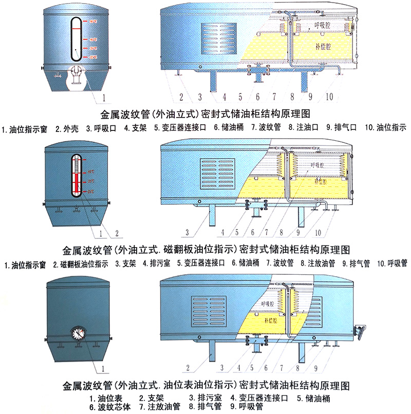 金屬波紋管(外油立式)密封式儲油柜,是我公司根據多年來用戶使用波紋儲油柜的意見和建議,研制生產的新一代儲油柜。它使用的是圓柱形波紋管芯體,實現變壓器油隨溫度變化的容積補償和油質保護。圓柱形波紋管,受力均勻,承壓能力強,不易失穩(wěn)變形。加工工藝簡單,更容易保證產品質量。該產品克服了外油臥式儲油柜運行時因受變壓器油重力影響受力不均,失穩(wěn)變形、出現卡滯、增大運行壓力等現象。和內油式儲油柜比較,波紋芯體受儲油桶保護,運行更安全可靠。該產品油位指示采用窗式指示、磁翻板油位指示、傳統油位表油位指示。指示刻度直接標出,準確、直觀、便于觀察,同時改變了多年來用“油位-油溫曲線板”的習慣。各種油位指示均設有高低油位報警裝置,可根據用戶需要輸出4~ 20mA模擬信號。金屬波紋管外油立式儲油柜性能指標先進,技術成熟可靠,造型美觀大方,是儲油柜的換代產品。